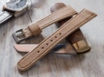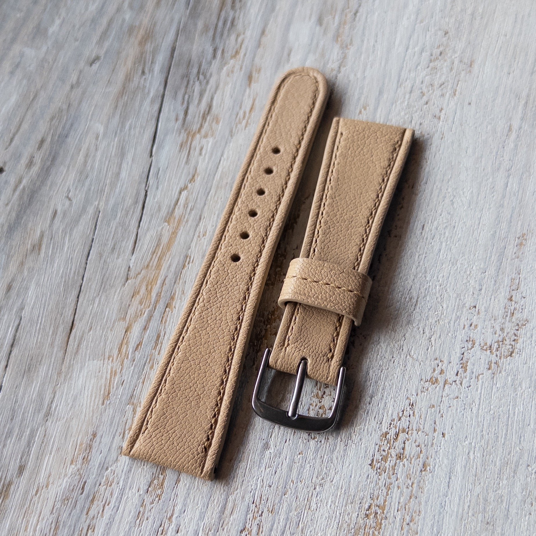 This listing is for a Classic watch strap with boxed stitching made from Natural Chèvre leather with a splendid antique look. The surface of the leather has a lot of depth. Definitely a great pick for vintage watches or modern watches with a vintage touch.