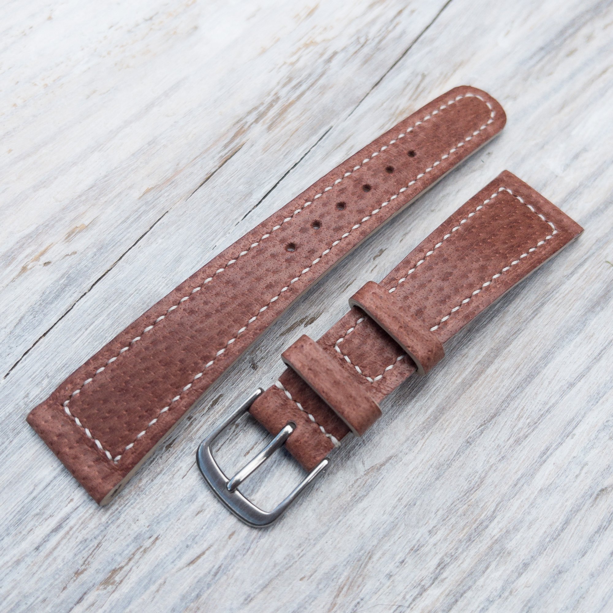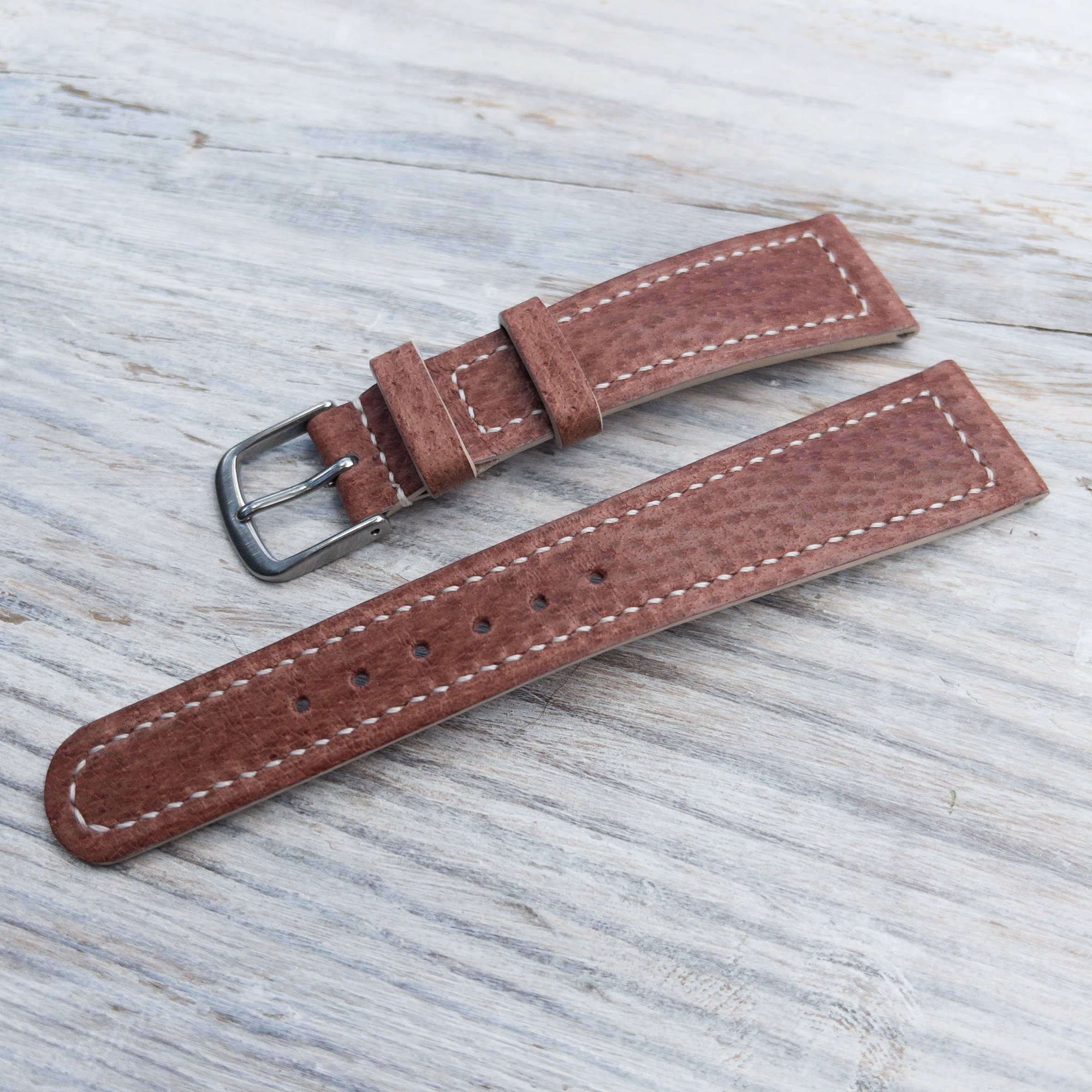 The upper leather is very vivid brown pigskin. The strap will consist of 3-4 layers of leather to accommodate even heavy watches. I can make the strap in a thickness from 1,5mm to around 2,8mm.