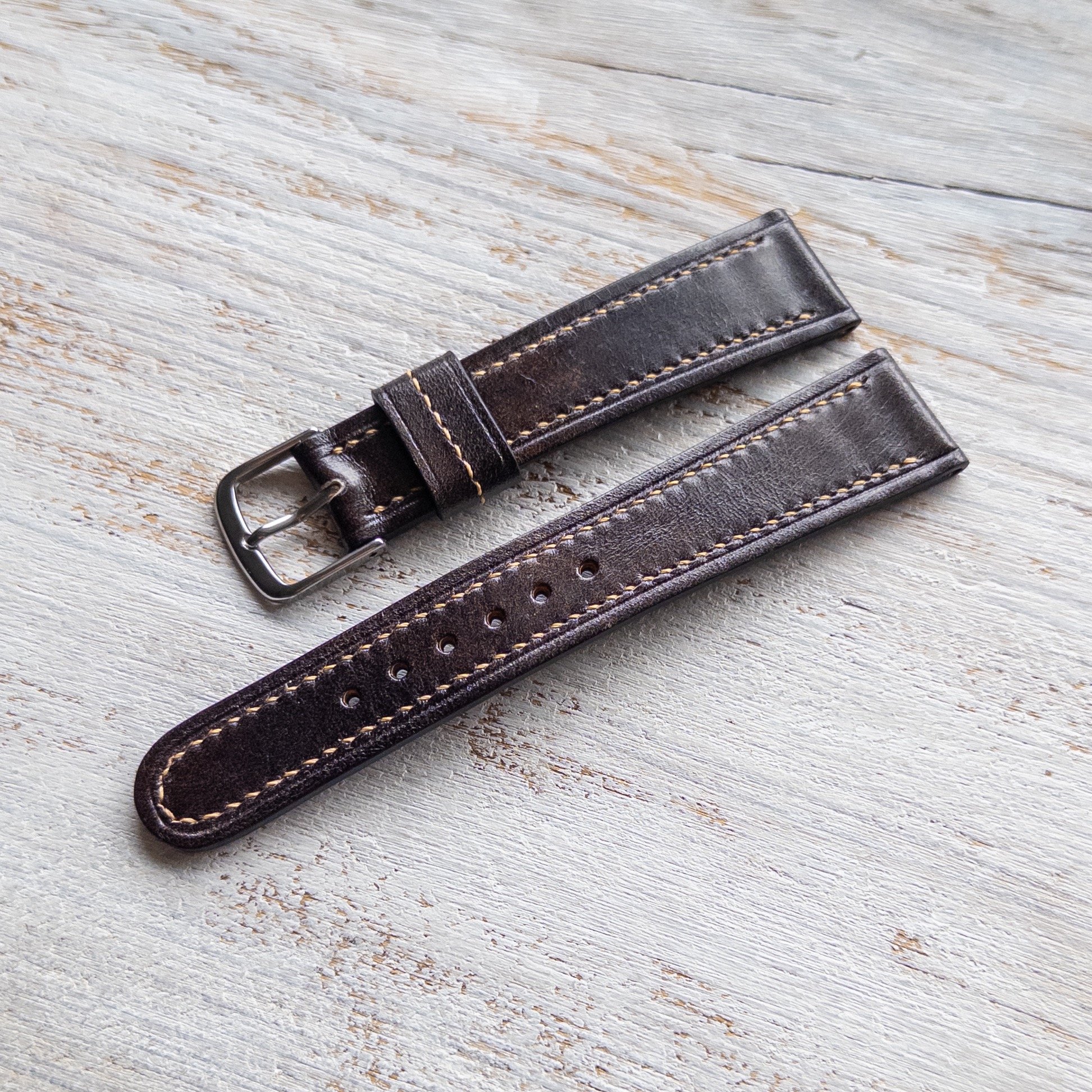 This strap design is from my new Artisan Series. If you want to replicate the straps from the 40s, then this is the way to go. Hand assembled, stitched and painted.