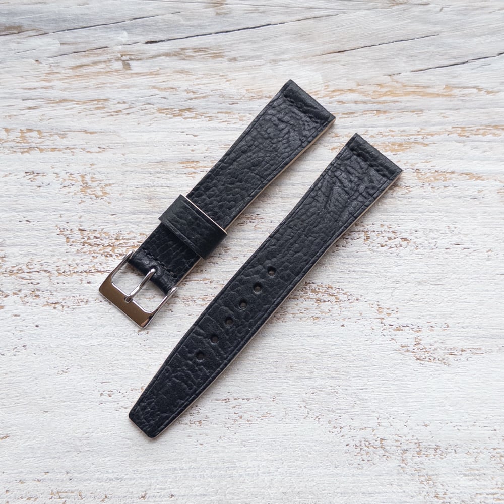 This strap is made from the finest Horween Derby leather. This vegetable tanned leather from the famous Horween factory has a very unique surface with deep wrinkles of a rather extraordinary kind.
