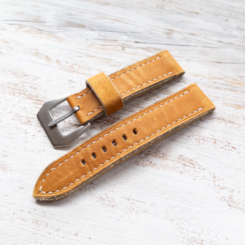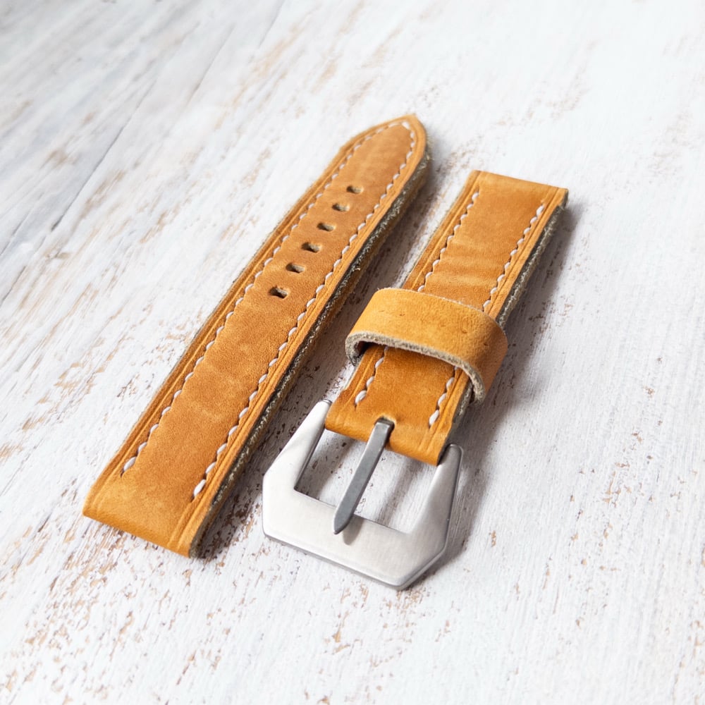 This strap is made from the traditional Horween Baseball Glove leather used to make baseball gloves.. This one was artificially aged but I can also make it without aging. Great for your rugged style.