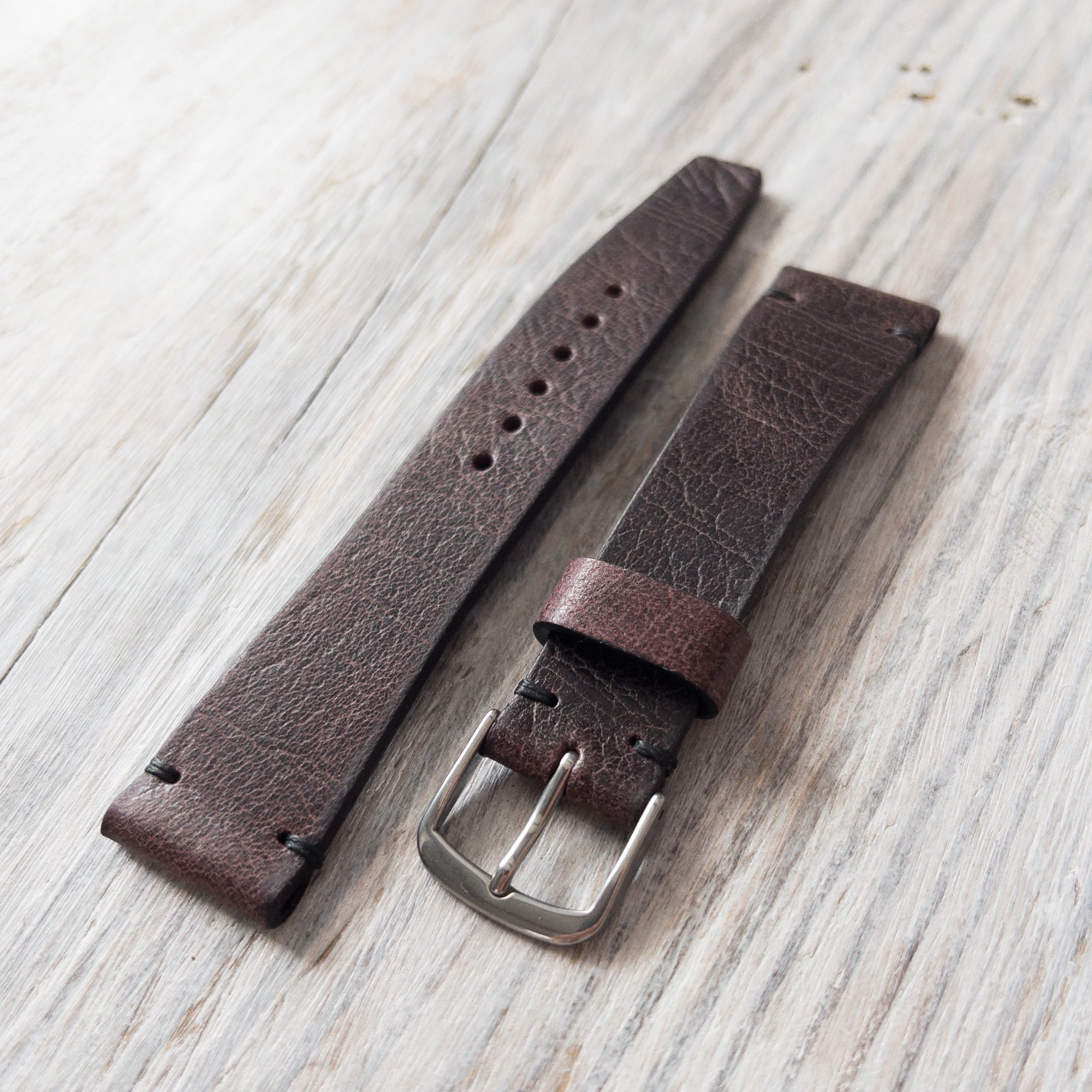 This listing is for a Vintage Style watch strap with simple stitching made from Eggplant-Brown Chèvre leather with a splendid antique look. The surface of the leather has a lot of depth.